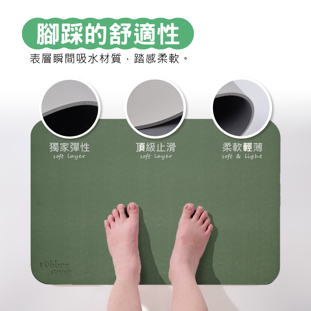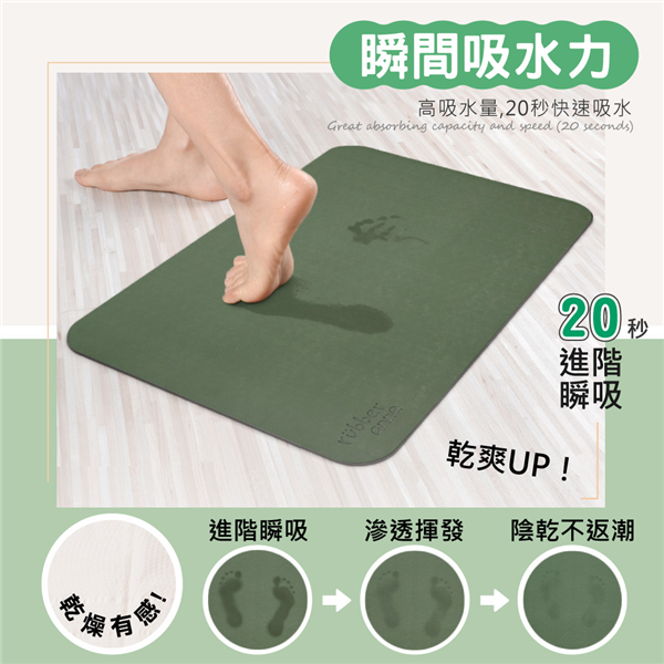 表層瞬間吸水材質,踏感好柔軟。底層植物萃取物製成,止滑效果佳。適用淋浴後經擦拭過的身體水量(傳統浴室)66x44×0.5cm